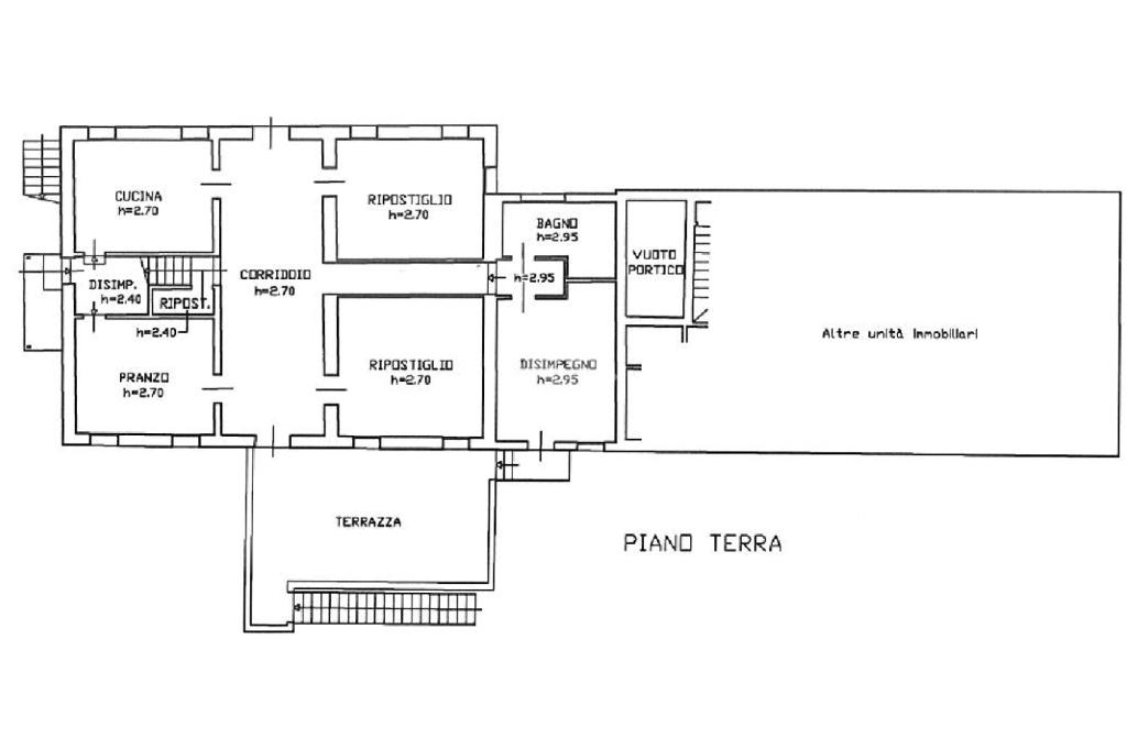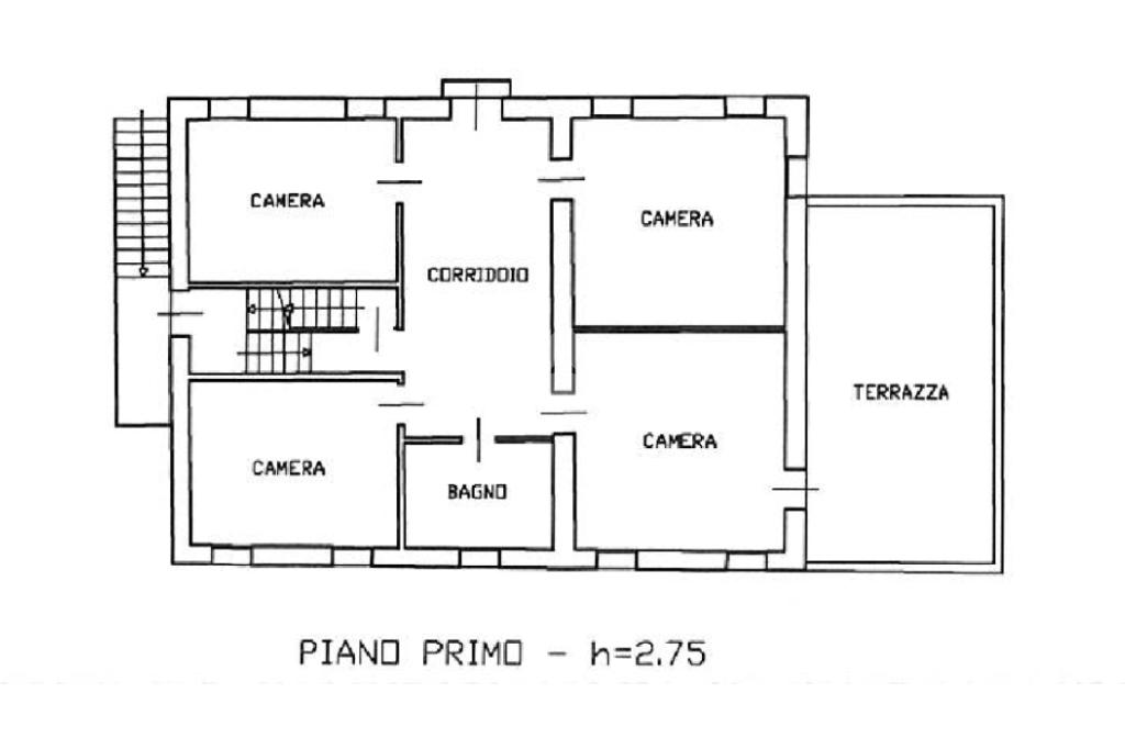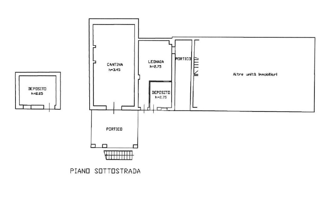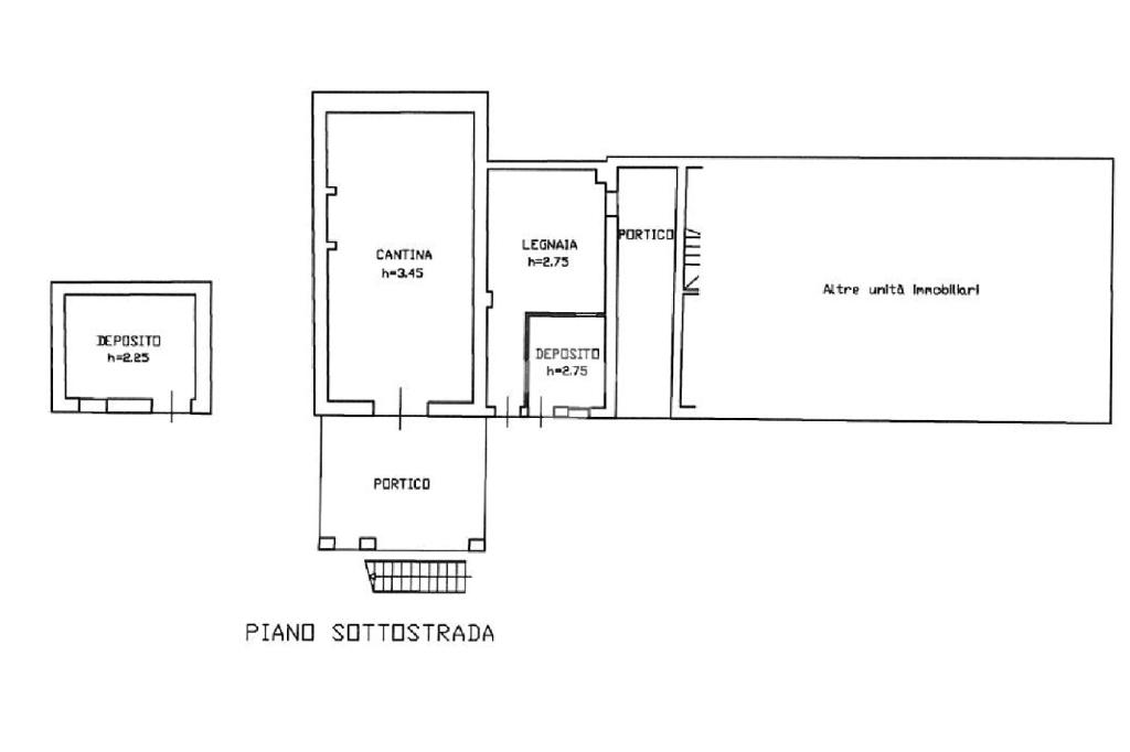 L’immobile si sviluppa su più livelli. Al piano sottostrada sono presenti deposito, cantina e legnaia. Il piano terra comprende disimpegno, bagno, due ripostigli, cucina separata e sala da pranzo. Al primo piano si trovano quattro camere da letto, un bagno e una terrazza. Il secondo piano ospita una soffitta.