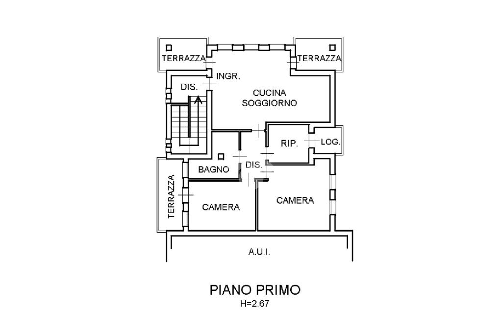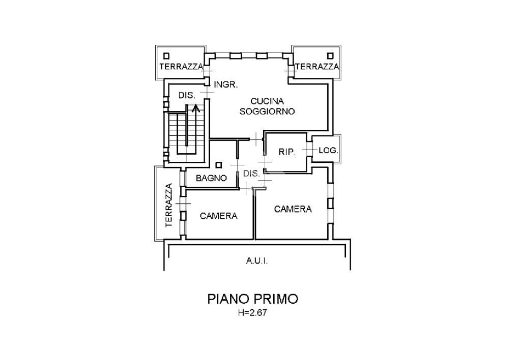 Al piano primo si sviluppa l’appartamento, composto da un luminoso soggiorno con cucina in open space con accesso a due terrazze. La zona notte offre due camere da letto, di cui una con terrazzo, oltre a una stanza aggiuntiva che può essere utilizzata come terza cameretta oppure come lavanderia, anch’essa con terrazzo. Completa il piano un bagno finestrato con vasca.